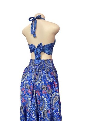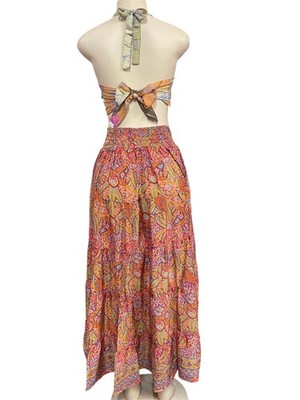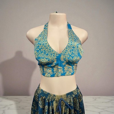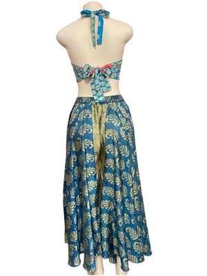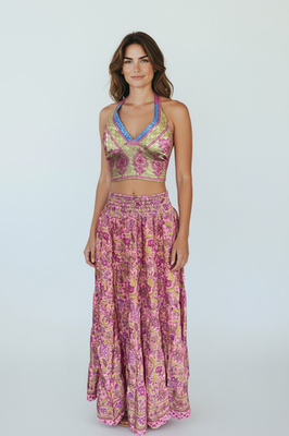 Immerse yourself in exotic charm and artisanal elegance with our printed silk top and skirt set, direct from the workshops of India. As a backdrop for designs inspired by traditional Hindu motifs, creating a combination of colors and patterns that reflect cultural richness and bohemian style. Crafted with care and attention to detail, this set incorporates the softness and fluidity of silk to offer you effortless comfort and style.