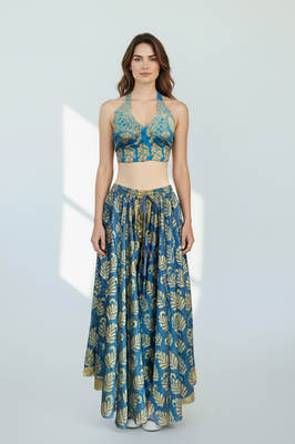 Immerse yourself in exotic charm and artisanal elegance with our printed silk top and skirt set, direct from the workshops of India.