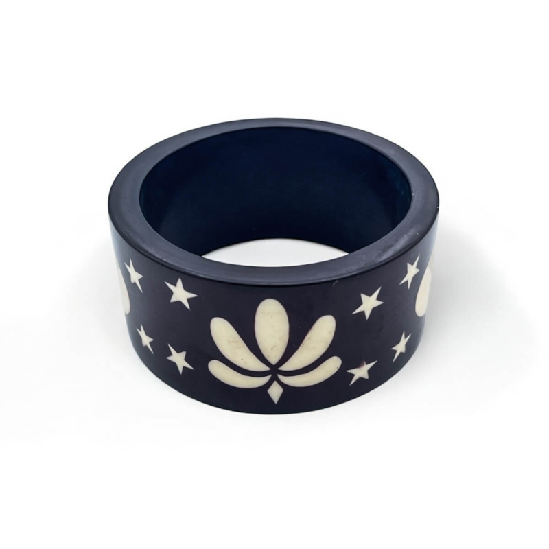 Black Resin Bangle with Stars & Lotus Flower Inlay – Celestial Boho Jewelry